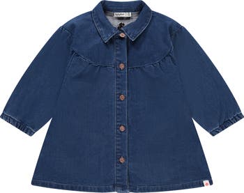 This rich blue wash long sleeve denim dress features seamed accent details at the top of the bodice and button enclosures.