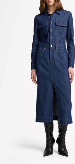 Channel casual sophistication in this long-sleeve midi dress fashioned from medium-wash denim.