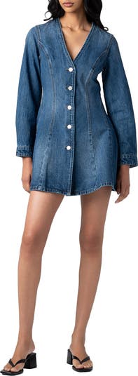 Precisely placed paneling creates a flirty fit-and-flare silhouette in this button-front minidress cut from indigo-dyed denim faded to old-favorite perfection.