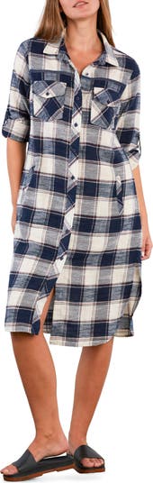 Soft fading and a subtle acid wash define a nonstretch denim shirtdress punctuated with a lattice trim along the front yoke.