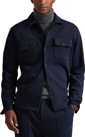 Prominent pockets add a double-knit fabrication define a layering shirt mostly made from soft cotton.