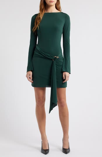 Made from a curve-hugging stretch-crepe jersey, this date-night-approved minidress features a draped overlay panel that cascades elegantly beyond the hem and is secured by a goldtone organic-shaped buckle at the waist.