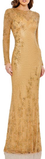 This long sleeve embellished gown features intricate detailing and a flattering silhouette, perfect for making a statement at formal events.