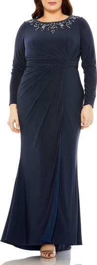 Long sleeve jersey gown with crystal-embellished neckline and twist waist. Elegant, comfortable, and perfect for any formal occasion.