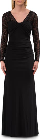 Simple evening dress with a unique ruched bodice and V neckline. The long sleeves features an illusion lace. Back zipper closure.