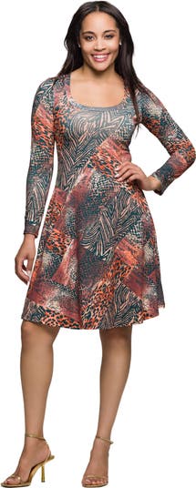 Make every occasion memorable with this brown multi animal print fit and flare dress. The lively patchwork of patterns adds bold personality while the scoop neckline and long sleeves keep the look classic and versatile. Designed with a flattering silhouette and knee length hem, this dress is perfect for both casual days and evenings out.