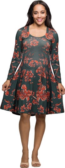 Refresh your collection with this green orange floral fit and flare dress that blends timeless charm with everyday comfort. The floral pattern stands out beautifully against the dark green background while the scoop neckline and long sleeves keep the design classic. Its flattering shape and knee length hem make it an easy go to for both casual and dressy moments.