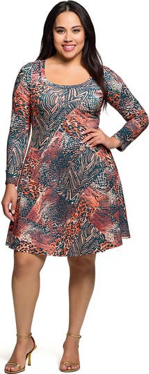 Make every occasion memorable with this brown multi animal print plus size fit and flare dress. The lively patchwork of patterns adds bold personality while the scoop neckline and long sleeves keep the look classic and versatile. Designed with a flattering silhouette and knee length hem, this dress is perfect for both casual days and evenings out.