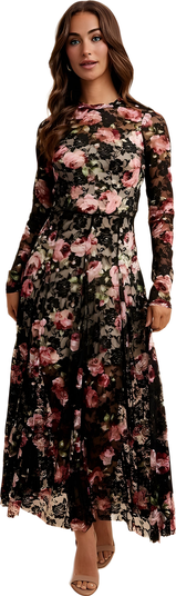 Elevate your next event with this stunning floral lace maxi dress from Knit & Lounge. Featuring a delicate overlay of black lace printed with painterly roses in soft pink and mauve tones, this silhouette creates a dramatic yet romantic effect. The full-length cut is balanced by sheer long sleeves and an illusion neckline, making it an elegant option for weddings, parties, or special evenings. Designed to move beautifully and feel effortlessly feminine.