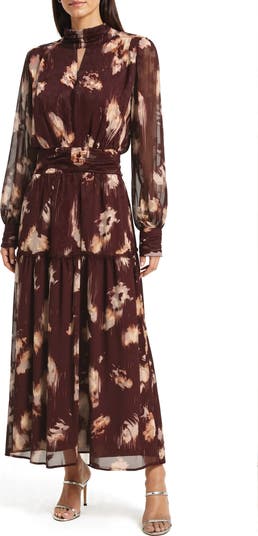 Elegantly draped and detailed in an abstract floral motif, this fluid maxi dress is cut from soft chiffon with a high neck, balloon sleeves and tiered skirt for a sophisticated silhouette. Smocking at the back waist shapes a perfect fit.