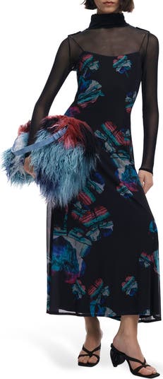 A mesh yoke and sleeves enhance the modern romance of an A-line dress in a dark floral pattern.