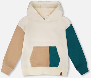 Playful and practical, our French terry hoodie in off-white is a must-have for cool kids. This pullover comes with a comfy attached hood, long sleeves, asymmetrical front pouch pockets, ribbed cuffs and hem, and bold colorblocks for extra style. Made from a soft cotton and polyester blend, it’s perfect for layering in the “B.O.Y.S.” collection.