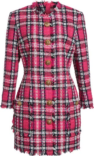 This iconic sheath-style dress is crafted from a bold plaid tweed woven with textural fringed yarn and finished with golden buttons down the front.