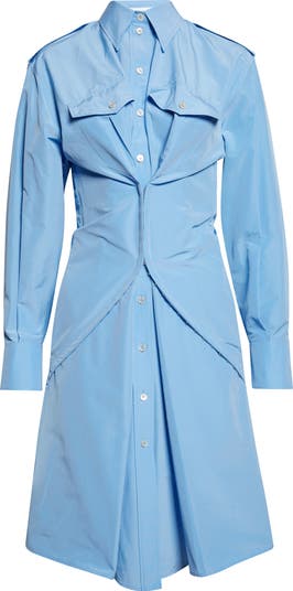Creative director Seán McGirr takes a McQueen approach to the classic shirtdress with a hook-and-eye overlay that cinches the waist for a corseted effect, creating a kicked-out front skirt. A high two-button collarband, pointed collar and epaulets bring a trench aesthetic to the edgy style.