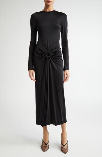 A gathered-ring detail brings texture and visual interest to the sleek, curve-hugging silhouette of this minimalist dress in high-shine jersey. A godet insert at the back of the skirt adds a gorgeous movement and flare.