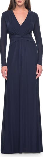 Long sleeve soft jersey evening gown with V neckline. The dress features ruching at the waist and sheer sleeves. Back zipper closure.