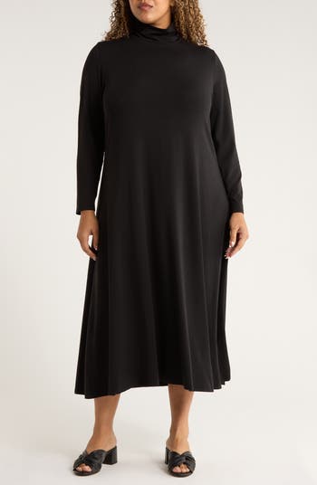 Stay comfy all day in this mid-weight jersey maxi dress topped by a turtleneck and framed by long sleeves.