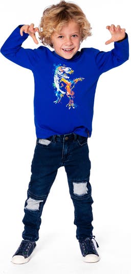 Freshen up his wardrobe with this colorful, playful dinosaur print top. With long sleeves and a crew neckline that make it easy to wear on its own or layer beneath a hoodie, this cotton jersey tee is sure to be a hit with any little dino lover.