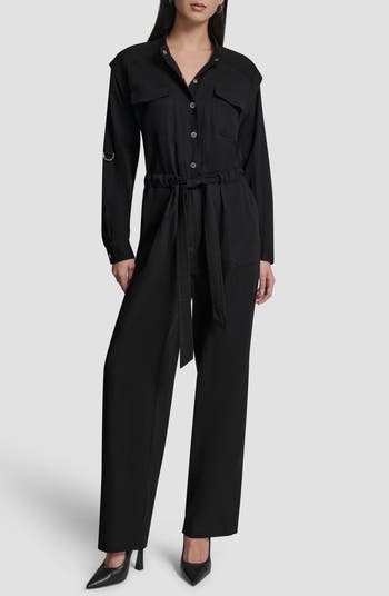 Workwear, streamlined. This long-sleeve jumpsuit features layered cap sleeves for modern dimension, snap closures and four pockets for utilitarian edge and a tie belt to define the shape.