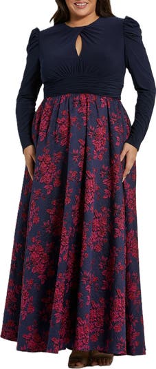 Enhance your evening style with our Long Sleeve Keyhole Knot Neck Floral Bottom Gown. The high neckline, puff sleeves, and ruched details create a statement look in luxurious jersey and brocade.