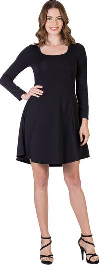 This fit and flare dress has it all, a lovely scoop neckline paired with fitted long sleeves alongside a figure flattering design. The fitted top portion and classic colors draw the eye while the knee length skater skirt creates a polished yet fun look!
