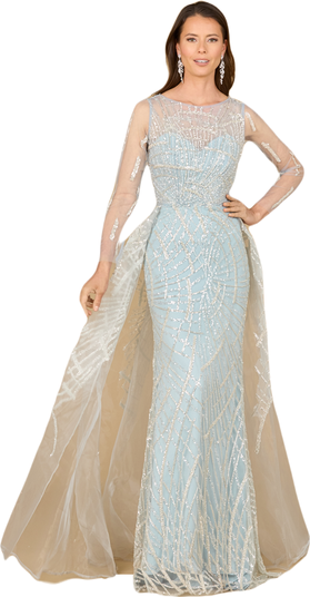 Beautiful gown covered in geometric beading and embroidered patterns featuring embellished sleeves, v-neckline and a gorgeous overskirt. This dress has a sparkling bodice and modest look.