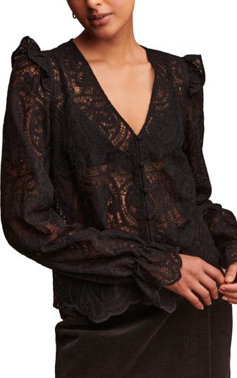 Worthy of a rom-com starlet, this dramatic lace top will have you ready for your close-up with ruffle-topped balloon sleeves, a graceful V-neckline and decorative covered buttons.