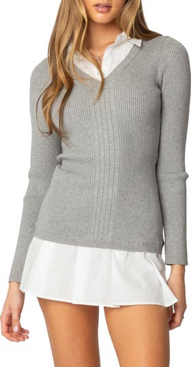 Effortlessly achieve the layered aesthetic with this supershort minidress featuring a crisp poplin base layer topped with a finely ribbed sweater.