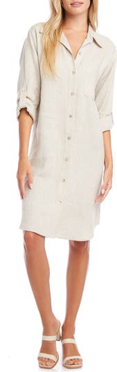 Lightweight linen brings airy ease to a breezy shirtdress designed with a spread collar and long sleeves with roll-tab cuffs.