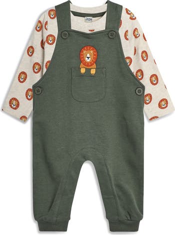 Your little cub will be the mane attraction in this adorable cotton set that pairs a lion-print T-shirt with fleece dungarees featuring a cute appliqué peeking out to say 'hello.'