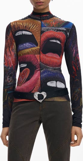 An abstract lip print artfully adorns on this clingy long-sleeve top styled for a sleek silhouette with a mock neck and exposed seams.