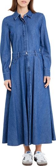 Embrace the down-home look of denim in this lengthy shirtdress signed off by a classic five-pocket design and a crisp point collar.