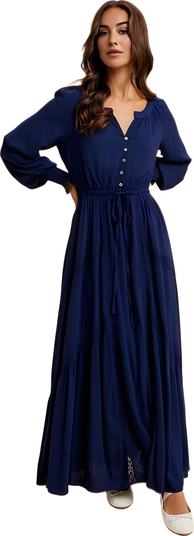 Elegant and versatile, this navy maxi dress features soft tiers and a cinched waist to flatter your figure with ease. The button-down bodice adds classic detail, while blouson sleeves with smocked cuffs create a romantic silhouette. Lightweight and unlined, it drapes beautifully for all-day comfort. Perfect with sandals or boots, this dress transitions seamlessly from day to night with a polished, relaxed charm.