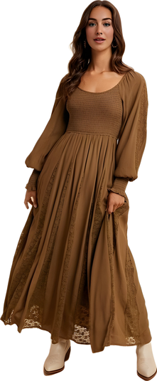 Long Sleeve Maxi Dress with Smocked Bodice and Lace Insets