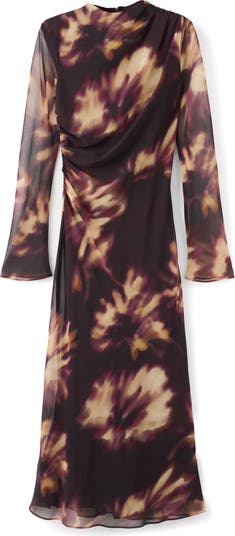 Rippled waistline ruching adds elegant dimension to a striking maxi dress styled for boho-chic vibes with a high neckline, flared long sleeves and a dazzling tie-dye print.