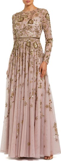 Grace the evening in this gown with long sleeves, floral sequin embroidery, and a flowing tulle skirt—perfect for weddings or formal occasions.