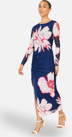 This elegant midi dress is crafted from lightweight mesh and features a striking oversized floral print, creating a bold yet refined look. Designed with long sheer mesh sleeves and a smooth, body-skimming silhouette, it flatters the figure while offering breathable comfort and stretch. Subtle ruching through the waist and hips enhances shape, while a side slit adds movement and a touch of allure—perfect for special occasions, evening events, or summer celebrations.