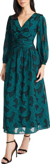 A rich burnout pattern adds beautiful texture to this long-sleeve dress while the swingy skirt brings effortless movement to every step.