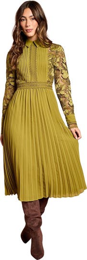 Exquisite lace detailing on sleeves and bodice. Elegant collared neckline with button-up front. Fitted waist with pleated skirt for a flattering silhouette. Long sleeves for sophisticated coverage. Midi length perfect for formal occasions. This stunning lace shirt dress from coast embodies refined elegance, perfect for those special occasions where you want to make a lasting impression.
