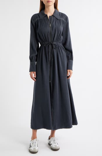 A simple zipper secures this long-sleeve, midi-length shirtdress with an adjustable rope sash.