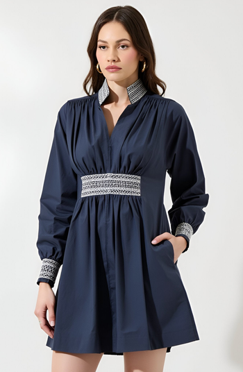 Long Sleeve Mini Dress with Embroidered Waist, Cuffs and Collar