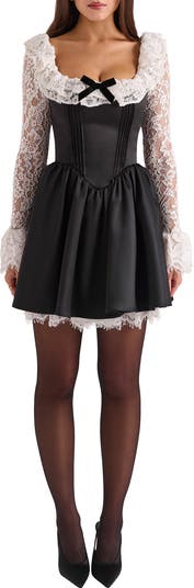 A corset-inspired bodice cinches the silhouette of this satin minidress popped with a puffy skirt and framed with floral lace.