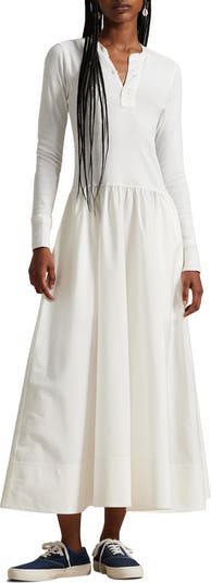 This cotton midi dress blends comfort and polish with a soft knit Henley bodice accented by shell buttons and a sweeping woven skirt. Finished with a shirred waist, ribbed cuffs and side-seam pockets, it's an easy, versatile style for everyday wear.