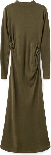 Gathering at the sides creates fabulous shape on this long-sleeve knit dress cut to a midi silhouette and topped with a sharp mock neckline.