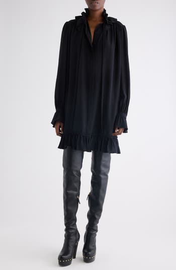 Creative Director Chemena Kamali channels '80s exuberance in this fluid silk crêpe de Chine minidress with flouncy ruffles offering a romantic yet restrained nod to the era's sensual silhouettes. Mother-of-pearl buttons add a refined finishing touch.