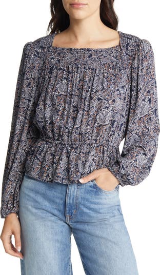 An intricate pattern emboldens a square-neck top framed by a flowing peplum and blousy sleeves for movement.