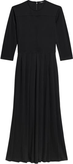 A signature clean-lined aesthetic informs a pleated dress that's easy to style up or down.
