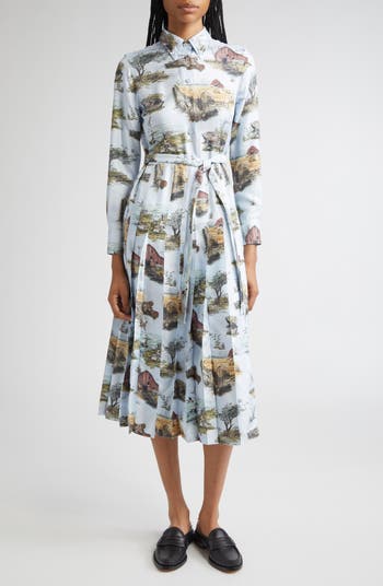 Long Sleeve Pleated Silk Toile Midi Shirtdress