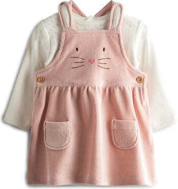 A sweetly embroidered bunny face decorates a soft corduroy pinafore dress paired with a coordinating pointelle bodysuit that's comfy enough for lounging and perfect for play.
