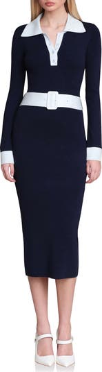 A contrasting belt, collar and cuffs heighten the preppy style of this curve-skimming knit dress.